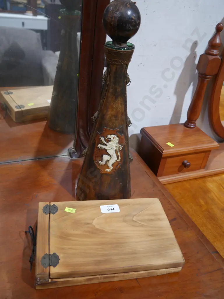 Leather wrapped decanter, wooden note pad